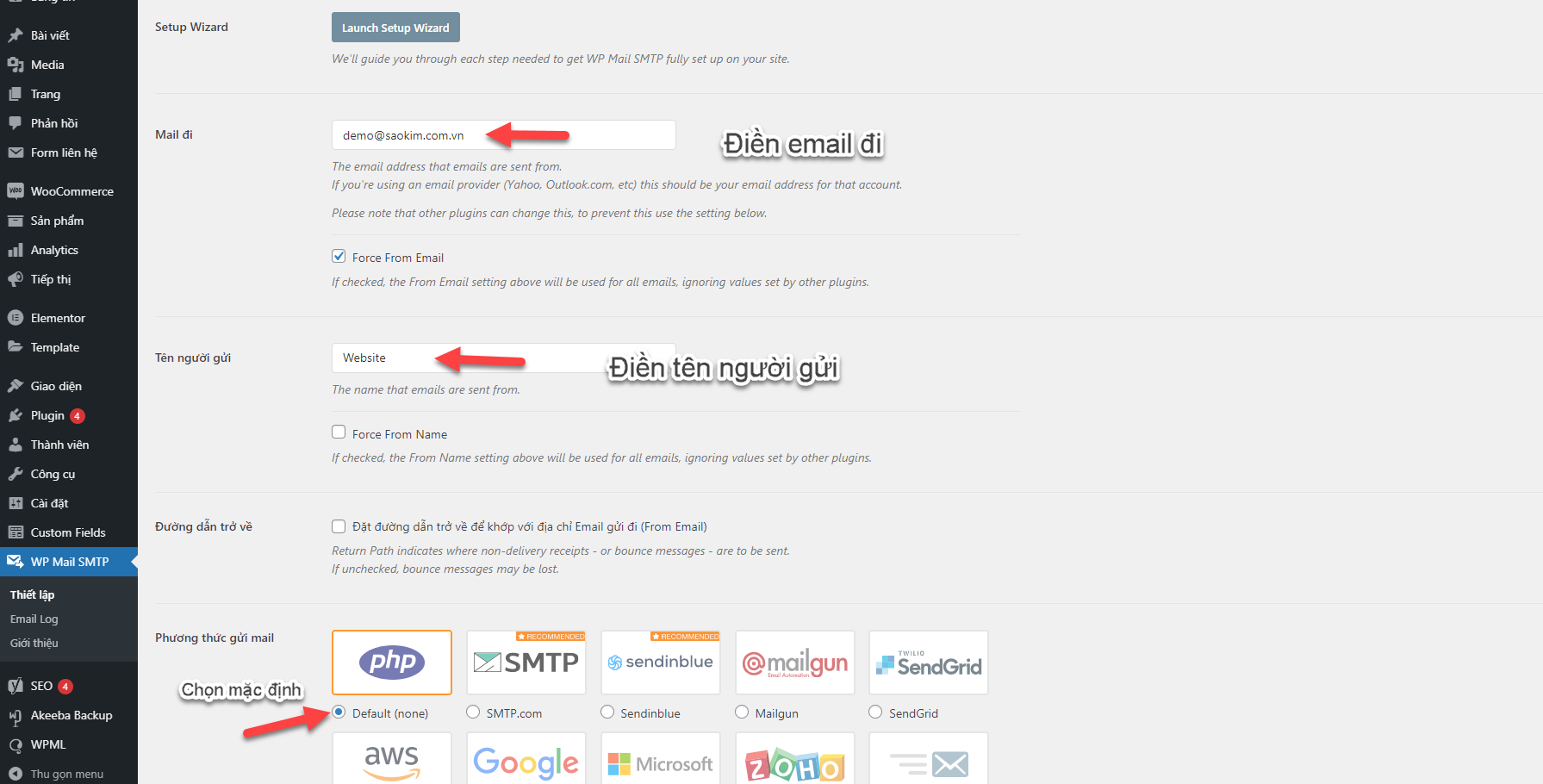 Mail đi: nên điền đúng tài khoản email mà các bạn sẽ dùng để gửi mail SMTP, nhất là đối với các dịch vụ như Gmail, Yahoo, Hotmail,…. Không điền các địa chỉ email ảo, không có thực hoặc sai tài khoản mà các bạn sẽ dùng để gửi trong bước setting bên dưới.