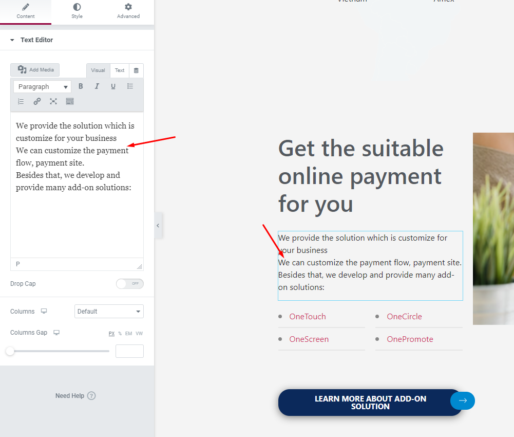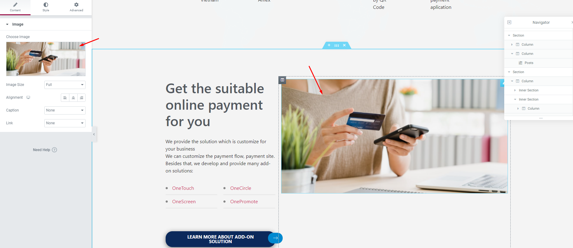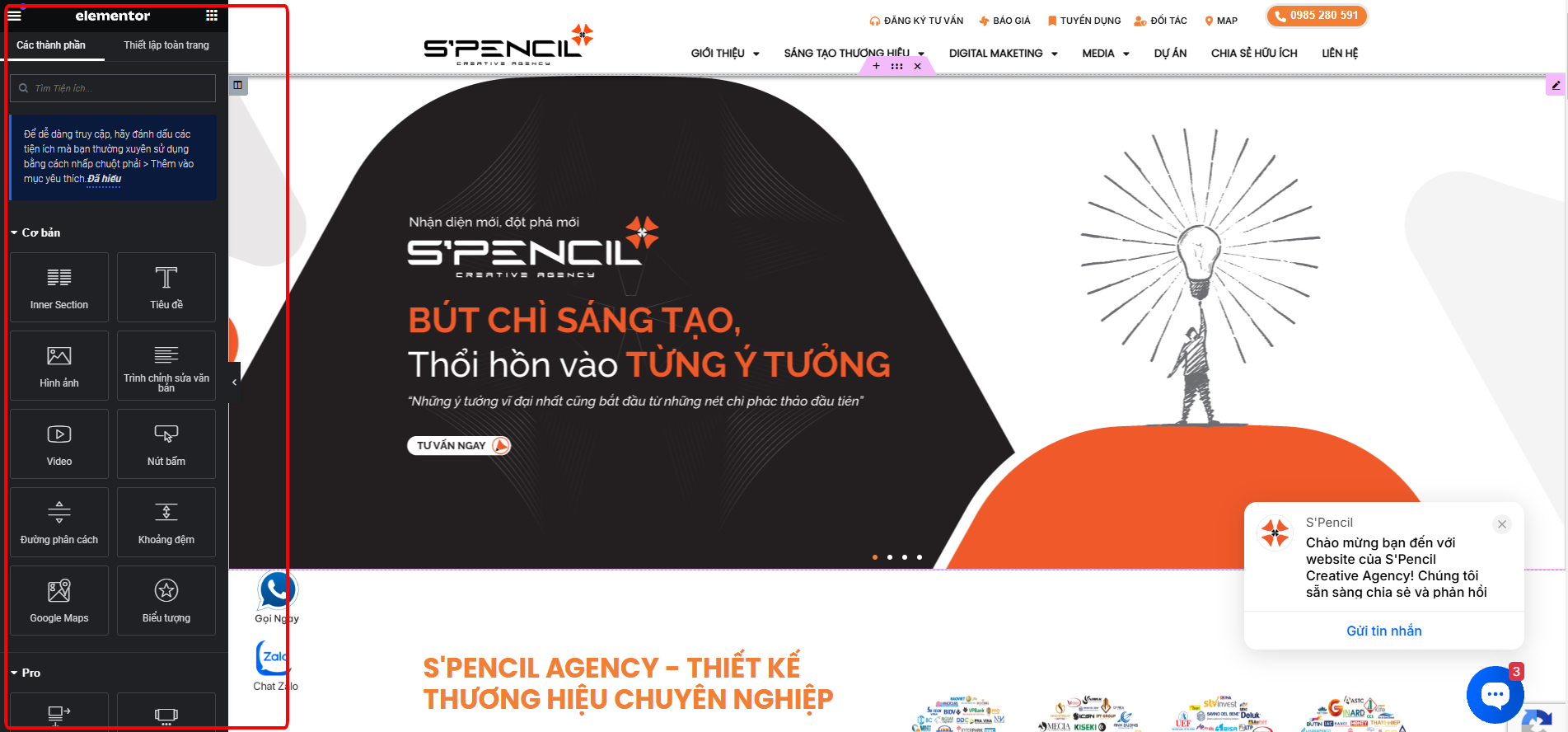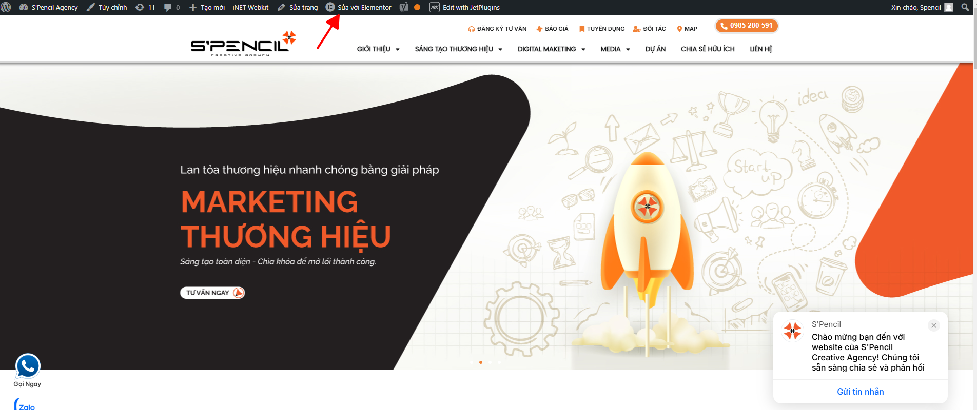 Khi muốn thay đổi nội dung hiển thị trên website vui lòng quay về giao diện người dùng, chọn vào thanh quản trị trên website(sau khi đăng nhập) chọn phần “Sửa với elementor”