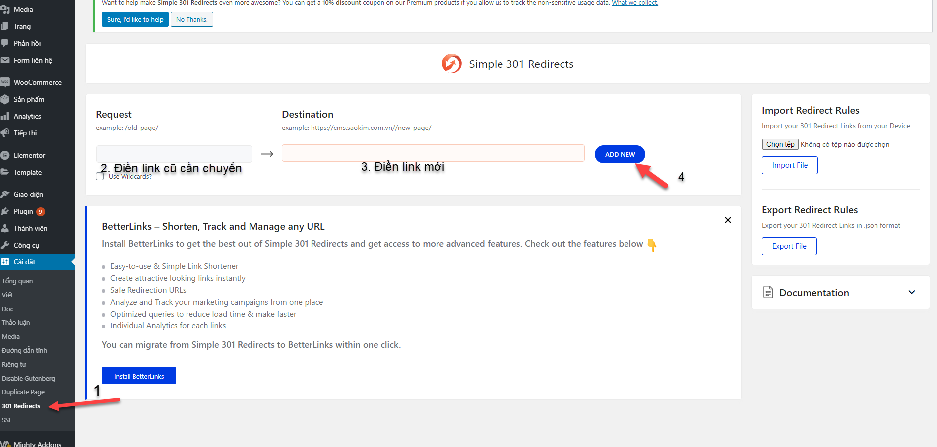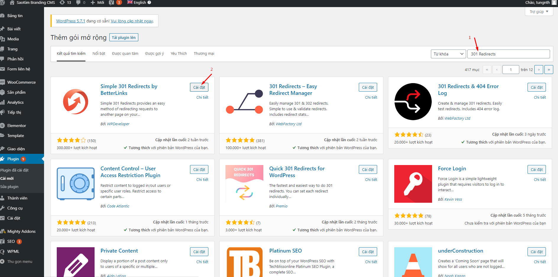 Tìm kiếm plugin 301 Redirects -> Cài Đặt -> Kích hoạt