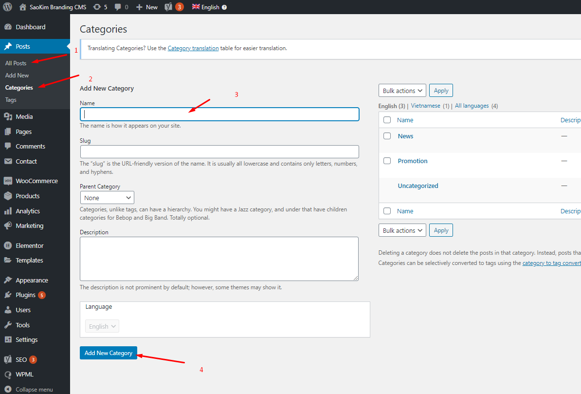 Vào categories -> Điền tên Category -> add new Category